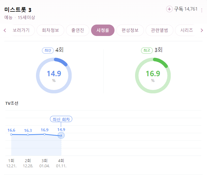 - 미스트롯3의 4회 방송은 전국 유료가구 기준 14.9%의 시청률을 기록하며, 4주 연속 목요일 전체 프로그램 1위를 차지했습니다.