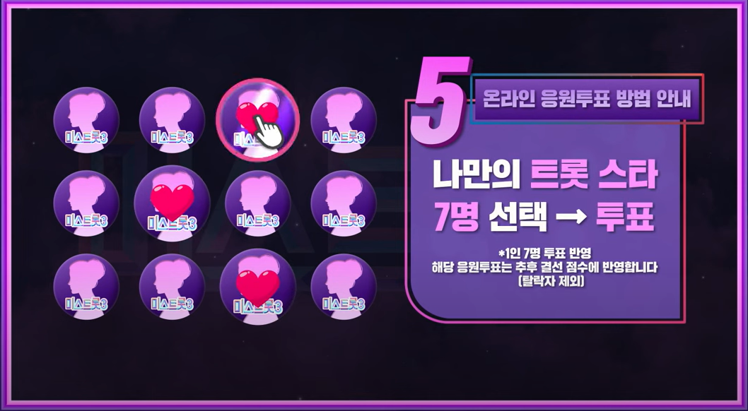 여기에서 응원하시는 7명의 참가자를 선택해 주세요. 투표는 매일 1회씩 7명에게 가능하며, 투표 기간은 7일간입니다.