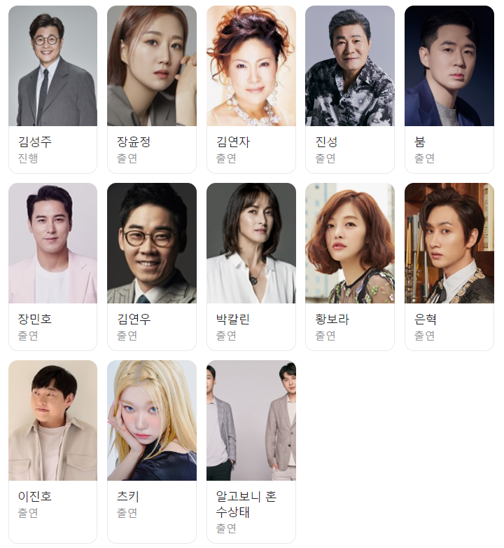 - 진성: 트로트의 황제로 불리며, '사랑의 콜센타', '뽕숭아학당', '미스터트롯' 등의 프로그램에 출연했습니다.